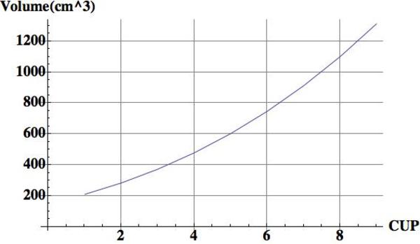 ついでに、アンダー75cmのA~Iカップの(1個あたり)体積を計算して、チャートとして描いてみると、下のグラフのようになります。横軸の1~9は、A~Iカップを表しています。