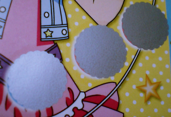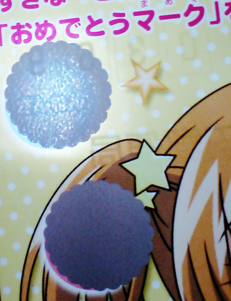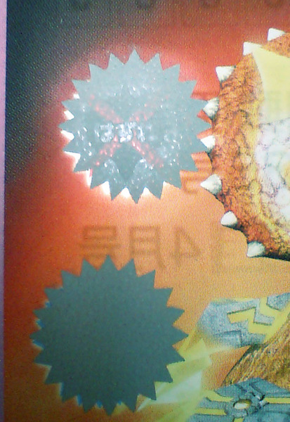 こういった「銀スクラッチ」は、後ろから強い光を中てると「(銀スクラッチの下に隠されている)こたえ」が浮かび上がって見えるものが多い。この小学一年生 四月号のプレゼントクイズの場合も、やはり後ろから光をあてると、答えが透けて見えてくる。右の画像は、きらりん☆レボリューション のイラストを白色LEDで背後から照らすことで、「あたり」と「はずれ」を透かし見た場合である。朱色インクで印刷された「あたり」と藍色インクで印刷された「はずれ」という文字が、やはり浮かび上がって見えることがわかる。  また、右の画像は、恐竜キング の場合である。やはり「(あたりを示す)ディノテクターのイラスト」と「はずれ ×」の違いを明瞭に見て取ることができている。それは、他の2つの たまごっち / ポケモン クイズでも同じである。
