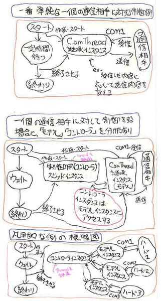 前回書いたように、(センサーやモーターといった)各ハードウェア機器に対するモデル・クラスをConThreadクラスを継承させて作り、また、制御を行うコントローラをThreadクラスを継承して作り、そのコンローラインスタンスに、各モデルのインスタンスを渡してやる、というのがComThreadを使い、複数機器を制御するのであれば、一番整理しやすいような気がします。