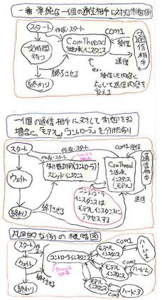 さて、これだけではつまらないので、今日は、ComThreadを使った「制御プログラムの作り方」で書いたことを図にしてみました。つまり、前回、文章とコードで書いた内容を「図」にしてみました。それが下の図になります。