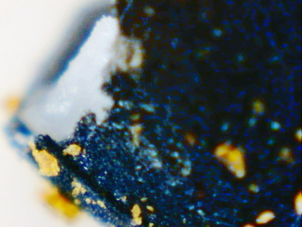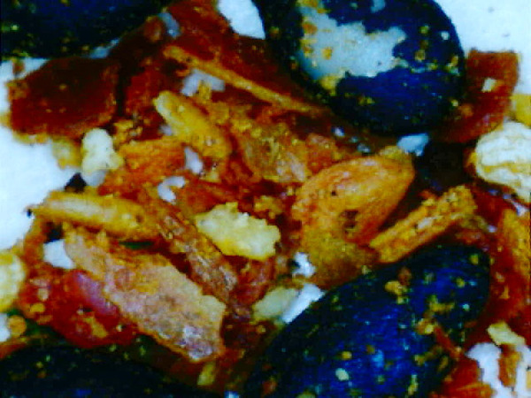 それはさておき、七味唐辛子をきちんと眺めたことはないような気がする…と思い、七味唐辛子を拡大して眺めてみた。拡大写真を撮ってみると、麻の実の周りに、細かく砕かれた赤唐辛子や黒ゴマがたくさん付いている。素人目にも、「七味」の分散状態は実に均等であるように見える。