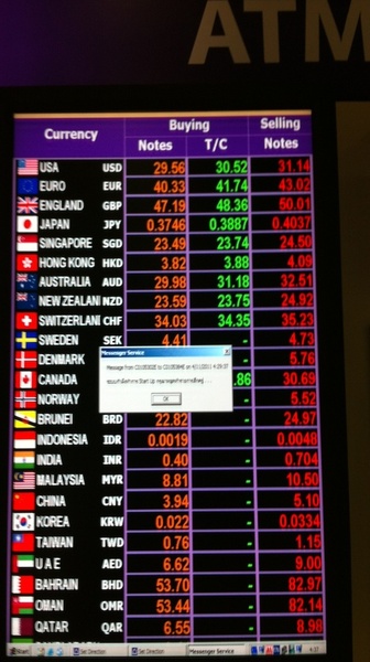たとえば、「両替レート」を映し出しているかに見えて実はエラーダイアログを表示したままの巨大ディスプレイ、そしてその近くではJavaアップデート関連のエラーダイアログを映し出している空港内の両替コーナーディスプレイ、HTTPエラー500番を表示したままのキャッシュディスペンサー、Windowsメッセンジャー関連のエラーを吐いたままウンともスンとも言わずに眠っている空港情報システム…。