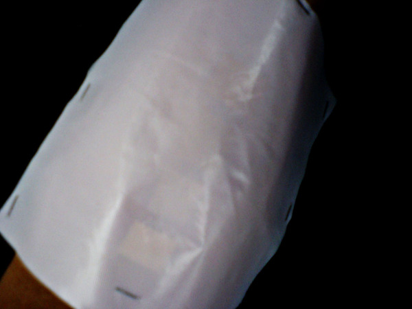 そこで、とりあえず「モカ茶の下着は透けない」かどうかを試してみました。と、いっても、「あくまで簡単な机上計算と机上実験で済む範囲」がhirax.netの守備範囲です。そこで、「腕に4種の色のテープを張り付け(右上の画像)、半透明のシートをその上に載せ、どの程度テープが透けて見えるか(右中の画像)の確認」をしてみました。肌の上に張られた「明らかに肌より明るい色から、明らかに肌より濃い色まで濃さの違うシート」が、薄いピンク色の半透明シート上からどのように見えるかを確認してみたのです。