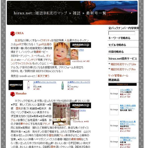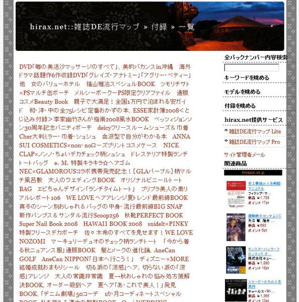「雑誌DE流行マップ Lite」をメンテナンスしました。Javascriptコントローラが度データ遅延・動的読み込み・各種表示を行う「雑誌DE流行マップ Pro」のような解析機能は持っていませんが、「あぁ、こんなものが流行っているんだなぁ。こんな付録に惹かれる時代なんだな、そして、こんな人が流行っているんだな」と、時折時代の流れを眺めてみるには良いかもしれません。