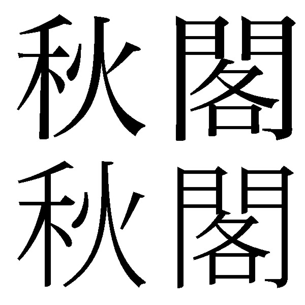 はたして、ヒラギノ明朝(上段)と小塚明朝(下段)で、「秋」「閣」という字を描いてみました。上に描いたのがヒラギノ明朝で、下段に描いたのが小塚明朝です。