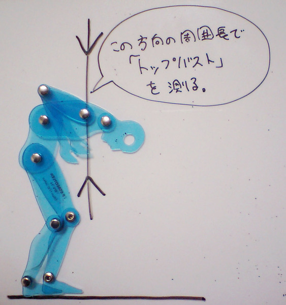 青山まりの「ブラの本。」を読み返してみると、「(まっすぐ立って計ると、実際より小さな値になってしまうので)90度の角度で、お辞儀をするスタイルでトップバストを計る」と書いてあった。つまり、バストの周囲の脂肪が胸部に集まり、そして伸びているような状態で胸部の周囲長を計るのが、トップバストの計り方の「実態」だというわけである。