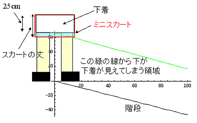 緑、すなわち、ミニスカートの丈が32cmの時は「下着防御ライン」は階段とほぼ平行である。それに対して、丈が30cmの時の「下着防御ライン」は、ミニスカートを履いた女性から離れるほど階段よりも上に離れていく。ということは、人間の視点位置が「下着防御ライン」を越えるということである。すなわち、下着が見られてしまうということだ。