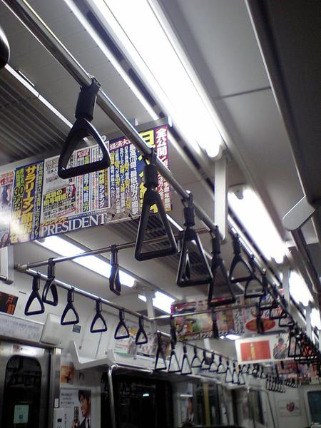 鉄道が大好きのテツちゃん、血液中には鉄分が流れまくり・・・というわけではないのですが、この列車の「吊り手」の方向変化にはとても興味を惹かれます。吊り手のベルト部分を剛体に変え、吊り手の(乗客が)掴む部分の方向を90度変えるという変更は、一見すると小さい変更のようでいて、実はとても大きな変更・効果が生じているように思えます。