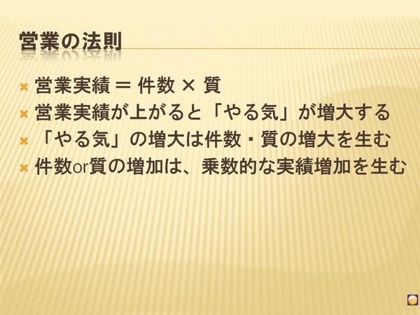 そんな実際の商品を売る作業が、営業だ。そんな営業の一面を表現する「営業の法則」を教えてもらったことがある。その「営業の法則」の1番目は、