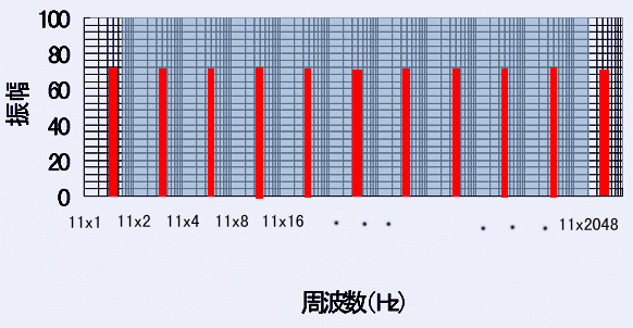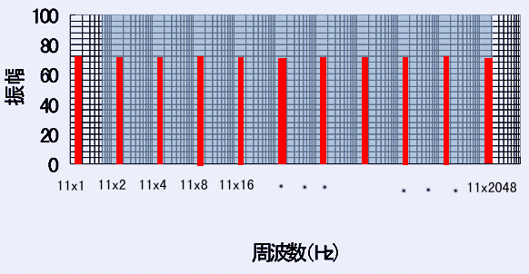 図で示すとこのようになる。なお、下の図中で水色は人間の耳に聞こえる周波数領域である。また、振幅はたんなる相対値である。