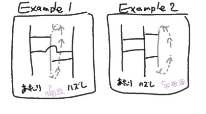 今回考えてみたいのは、こういったスペシャル技を、ちまり時間軸を捻じ曲げるような「線」をどう扱うか、ということです。「どう扱うか」というのは、「どう考えると、単純に思えるか」ということです。「単純で共通なルールで記述できるか、と言い換えても良いかもしれません。