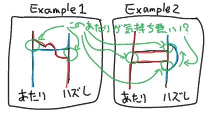 横線同士が交差していたり、同じ縦線同士を繋ぐ線の後ろに「仮想縦線」が隠れていると考えてみると、あみだくじの「(スタート地点とゴールとの)一対一対応といった特性はそのままに(それ以外の特性も前回考えたようにそのままに)、「あみだくじの無限ループ線」が存在しうる、ということになります。