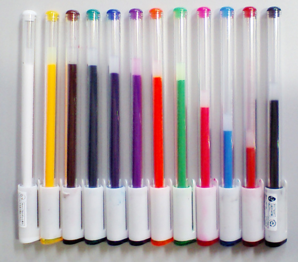 好きな色・見やすい色・落ち着く色……人それぞれ選ぶ色は違うと思う。たとえば、右の画像はふだん私が持ち歩いている12色のカラーボールペンである。12色あるけれど、並べてみれば、インクの減り具合から実際には(すでに何本目にもなっている黒と白のボールペンを除けば)7色くらいしか使っていないことがわかる。つまりは、これが私の「パレット」ということになる。