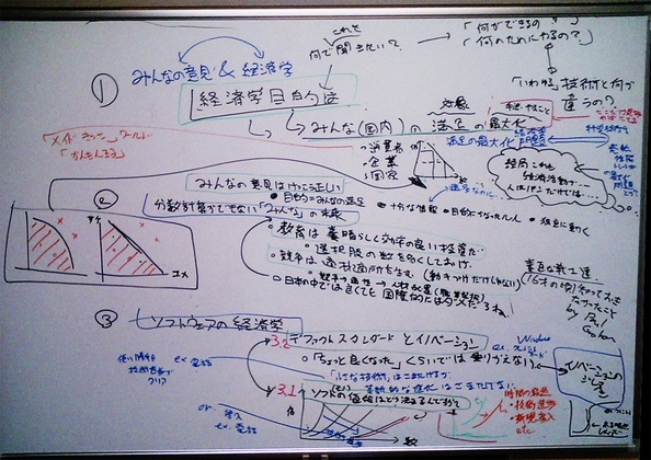 先日行った、西村和雄 京都大学経済研究所教授へのインタビューの「まとめ」板書です。「選択と未来」「イノベーションのジレンマ」「(16才の頃)知っておきたかったこと」など、なかなか興味深い話が登場しています。