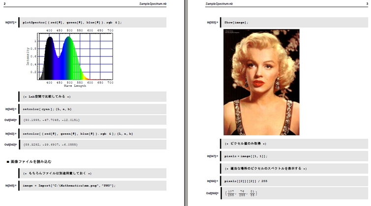 Title 色処理・スペクトル処理で遊ぶためのMathematicaノートブックを作ってみました(Mathematicaノートブック, PDF)。このノートブックはあくまで遊び用ですから、「できること」はとても限られています。けれど、Mathematica初級者が(Mathematicaの使い方を覚えながら)色処理・スペクトル処理を行おうとする時のスタート地点としてならば、少し役に立つかもしれません。例えば、plotSpector red なんてタイプすれば、右の画像中にあるようなカラフルなスペクトル・グラフが表示されたりします(右の例はシアンを表示したものですが)。Titleまた、rgb = fitSpector cyan, red, green, blue なんてタイプすれば、シアン色を(スペクトル分布を考慮した上で)RGBに分解できます。もちろん、fitSpector hogeColor, cyan, magenda, yellowなら、hogeColorをcyan,magenda,yellowというスペクトルで再構成できるわけです。あるいは、setcolor cyan ; {L, a, b} なんて入力すると、任意のスペクトルをLab色度座標を計算したりできる…という具合です。