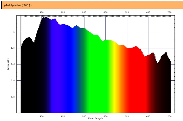 このノートブックの一つの特徴は、連続する「スペクトル」を(離散的なリスト)でなく「関数」として取り扱うところです。ですから、cyan467.34なんて入力すると、波長467.34nmでのシアンの光強度が出力されたりもします。そして、そんな関数主体の使い方をしてみることで(例えば plotSpector .5 D65# + .5 D50# & という風に)、「純関数(無名関数)」を使うことにも慣れてくるといった副次的な効果もあるかもしれません。