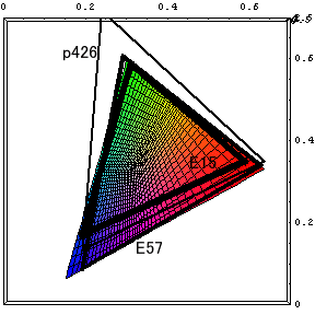 というように示してみた。それぞれの三角形の中の領域の色が各ディスプレイのカラープロファイルに記述してある出力可能領域である。