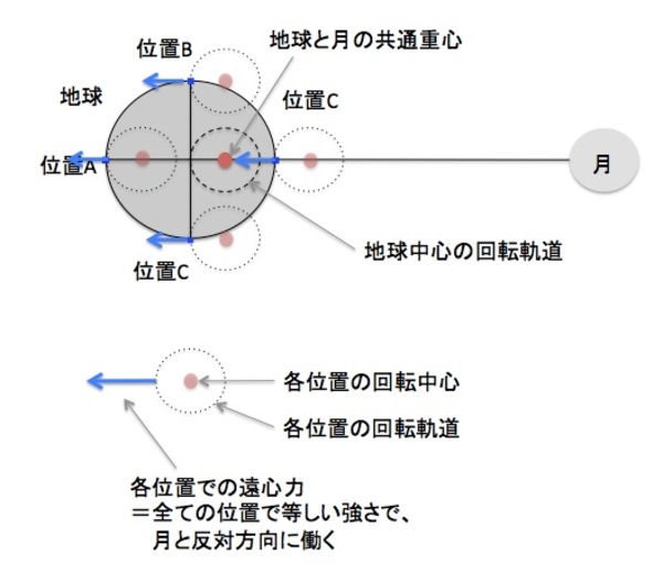 地球と月は、(地球と月を合わせた)共通重心を中心として回転(公転)しています。そんな公転を地球上の各位置が行う時には、地表上の各点は同じ等速の円運動を行い、(その等速円運動する状態を基準とすると)どの点も「月がいる方向とは反対側に働く」同じ大きさの遠心力を受けることになります。