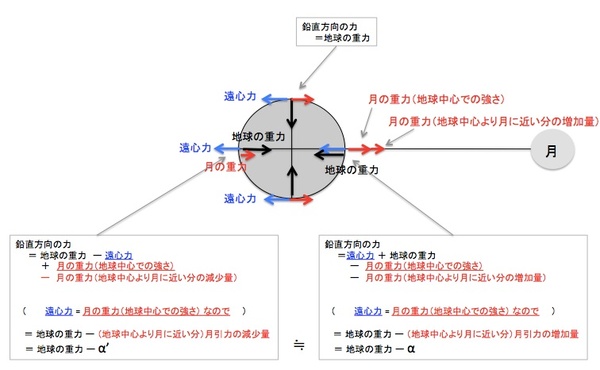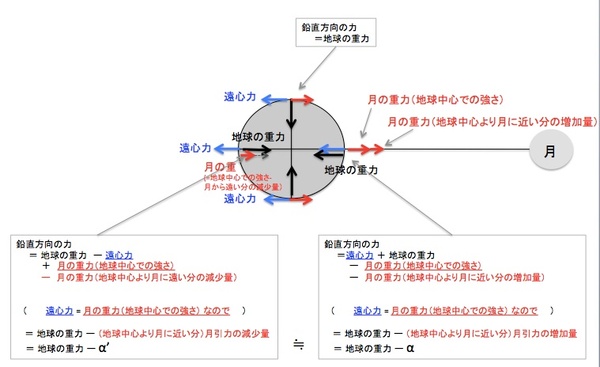 …単純に添付図を描いてみたかったという理由で(あと遠心力の差で月反対側の海が盛り上がるという誤解に対するフォローとして)書いた記事です。