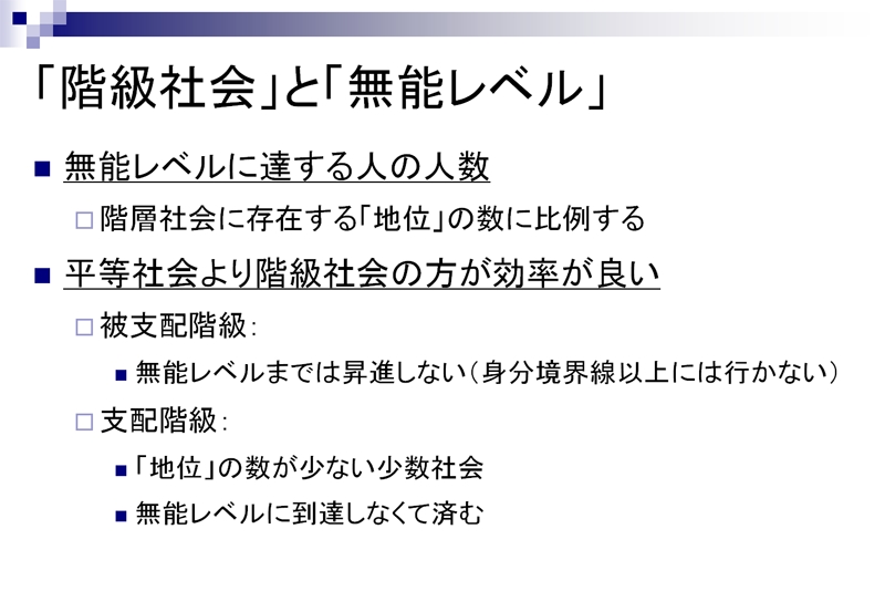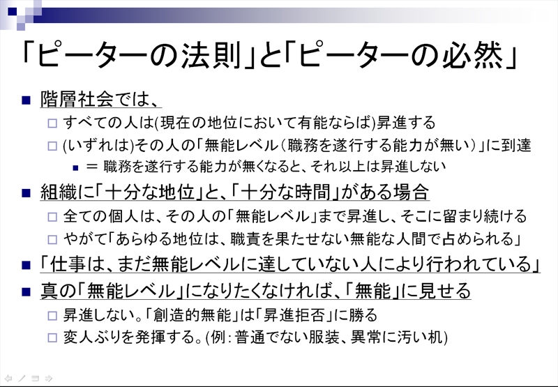 『ピーターの法則とは,「人々は自らが無能になるレベルにまで昇進する」という社会現象を扱った概念だ。階層構造を持つ組織において,人々は自らの能力を発揮できる階層に居る間は昇進を続け,能力を発揮できない階層に達すると昇進が止まってしまう。かくして,組織の内部は無能な人々ばかりで埋め尽くされてしまうことになる』 また、『階層社会のすべてのポストは、その責任を全うしえない人々によって占められるようになると同時に、仕事はまだ無能のレベルに達していない人々によって遂行される』