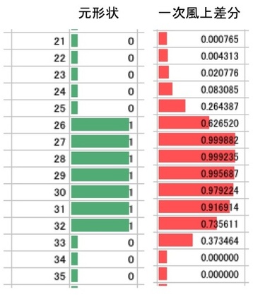 たとえば、右の図は「等速度で動く”矩形状分布”」が動くさまを、一次風上差分を用いて計算してみたものです。左が元形状で、右が計算が100ステップほど進んだ時の計算結果です。本来カクばったゴツい形状のはずなのに、滑らかな「おっぱい」形状に姿を変えてしまっているのです。ただ動くだけで元の形が変わってしまうなんて、計算処理としては大問題です。