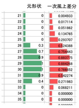 それが、右図の例になります。シミュレーションで作成したCカップ形状の分布を、(同じく一次風上差分を用いて)動かしてみた、というものです。初期には「滑らかで魅力的なバスト形状(左図)」であったものが、ただ等速度で動くさまを計算した結果(右図)は、なぜか周囲に伸びて広がってしまい、元の形状の魅力が半減していることがわかると思います。…これほどに、(本来は姿を変えないはずなのに)形状が変わってしまう、というのは大問題なのです。