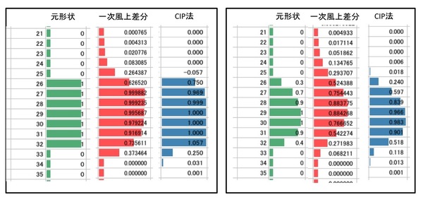 CIP法は、元の形状の各点における傾きがどのように動いていくかも解き、差分化された点以外の場所における値を「周囲の”値”と”傾き”から算出する」ので、「平均化」による数値拡散を防ぐことができます。たとえば、山(単バスト)の中央の値を求めるのに、山(単バスト)の左右中腹の平均値を計算しようとするのが、1次風上差分であれば、山(単バスト)の左右中腹の高さと傾き(傾きの”流れ”も計算するのです)から中央の高さを求めようとするのがCIP法です。その違いを考えれば、「なるほどCIP法を使えば”形”が崩れにくそうだ」と納得させれるのではないでしょうか。