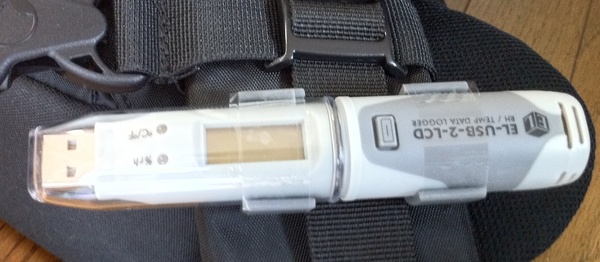 そして、購入した温湿度ロガーを普段持ち歩く鞄にくくりつけてみました。つまり、これで24時間自分が感じる「暑さ」や「涼しさ」、「蒸し暑さ」や「不快さ」を数字にし、その数字を眺めて遊んでみよう!というわけです。ジャック・バウアーは、犯人と24時間戦い続けていますが、こちらは、温度・湿度と24時間、戦い続けてみよう…というわけです。