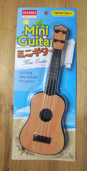100円ショップの「ミニ竹製ものさし+輪ゴム」セットにアンプを付けて、で沖縄三線気分に浸ってみるで物体の振動をピックアップする回路を作ったので、今日は100円ショップのダイソーに行き、消費税込みトータル108円でギターみたいなマンドリンみたいな4弦の楽器玩具を買ってみました。