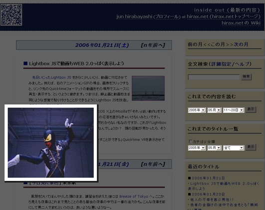 とりあえず、Windows上のIE6, Firefox, OperaとMacOS X上のMozillaで「それっぽい動作」をするようです。 いまだに、「WEB 2.0」というものが何なのか全然わからない私なのですが、これが「Lightbox JSで動画もWEB 2.0っぽく表示する」という感じなんでしょうか? 頭の回転が早かったら、そういうことを理解できるんでしょうか…?