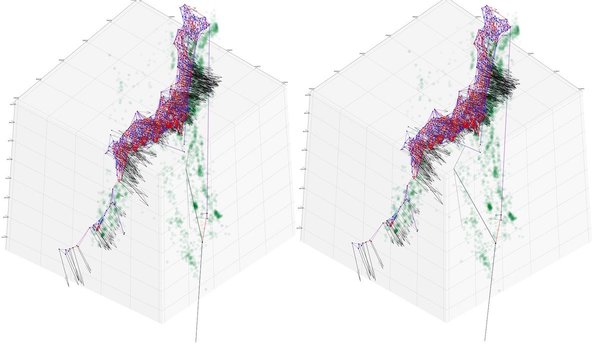 また、記事中の解説コードや処理はすべてフル3Dです。つまり、たとえば、The Looking Glass をお持ちなら、日本の地殻変動をリアルに立体的に眺めることができる…ということになります。プレート境界で揺れ動く日本列島の動きを、立体的に眺めてみるのも面白いのではないでしょうか。