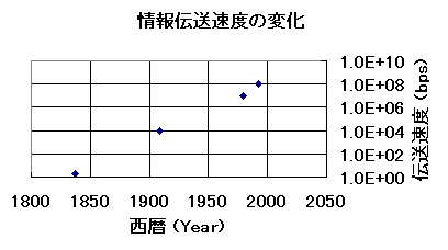 西暦 内容これを全部転送速度に直してみる。といっても、よくわからない部分も多いので、私が適当に決めてみる。それでは、その変化を示してみよう。とりあえず、ここ200年位の間のものを考える。