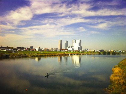 都会的な景色が写る川面の上を、静かに早く、舟を漕ぎ進む人がいる。顔を上げて、道路の上を眺めみると、空に映えるビルを背にしてアスファルトの上を歩く人が、たくさんいる。