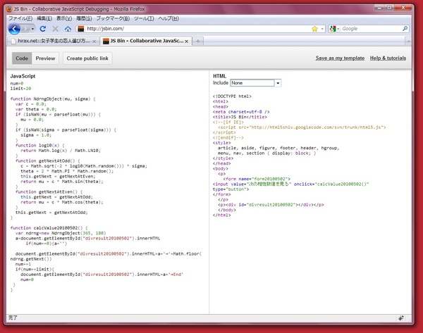 そんな時に、欠かせない環境がJavaScriptとHTMLコードを並べ見つつ書くことができ、さらに、それらのコードを実行・動作させることもできるJS Binです。色んなJavaScriptライブラリを読み込むことができたり、叩き台・スケルトンをある程度作ってくれたり・それを保存できるのも、とても便利で手放せません。